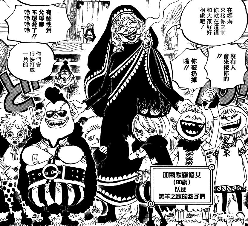 PS:皮埃克罗还是大妈儿时的伙伴,一同被修女加尔默罗收养,图中右2就是皮埃克罗小时候,那标志性的红嘴唇,以及长手族的身份都可以证明,另外左2就是后来的高利贷之王杜·费尔德,左1是后来的CP0特工。