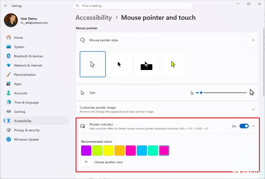 指针指示器新功能从构建26300.8085开始,Windows 11添加了指针指示器功能,帮助视力低下的用户更容易定位和使用鼠标指针。