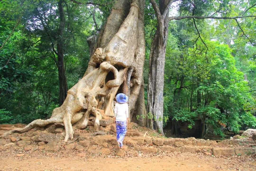 塔布笼寺最震撼的是,这座神庙被千年的古树攀爬,缠绕。树干高耸入云,树根盘根错节,像一条条巨蟒穿过了神庙的窗户,撕裂了神庙的璧廊,挤压的庙门,捏碎了石板,腾空而起,内部中空。