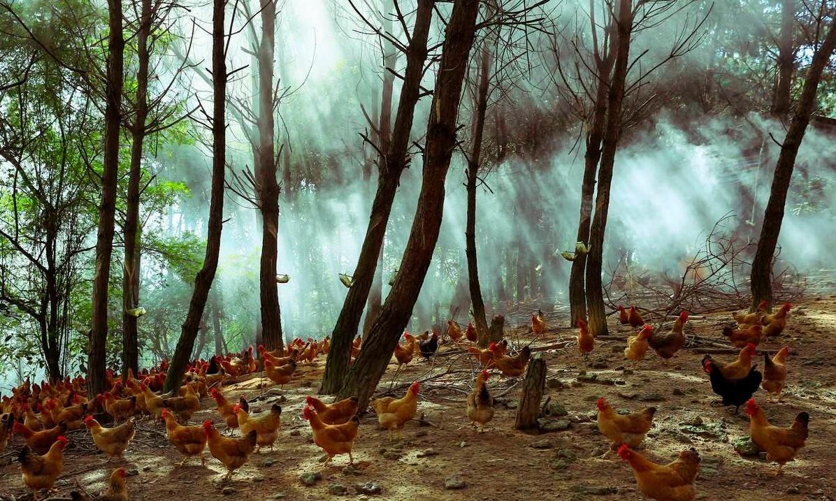 林子要通风透光,不能太密,也不能太稀,就像给鸡搭了个天然遮阳棚,冬暖夏凉。