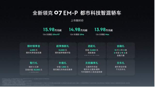 全新有为,极智新境。9月25日,都市科技智混轿车——全新领克07 EM-P正式上市。新车共推出126长续航Max、126长续航Ultra、126长续航Ultra H7三款配置版本,上市限时价13.98万元起。同时,全新领克07 EM-P还准备了限时领享金、超享焕新礼、选配礼、金融礼、智行礼、补能礼、无忧臻享礼、交车礼在内的8重限时福利。