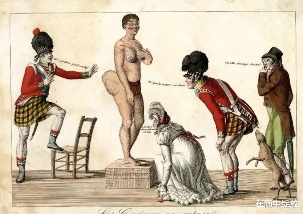 观众们可以花额外的钱来触摸她的身体,特别是她臀部的脂肪堆积。在这样的"展览"中,她遭受了难以想象的羞辱和身心创伤。