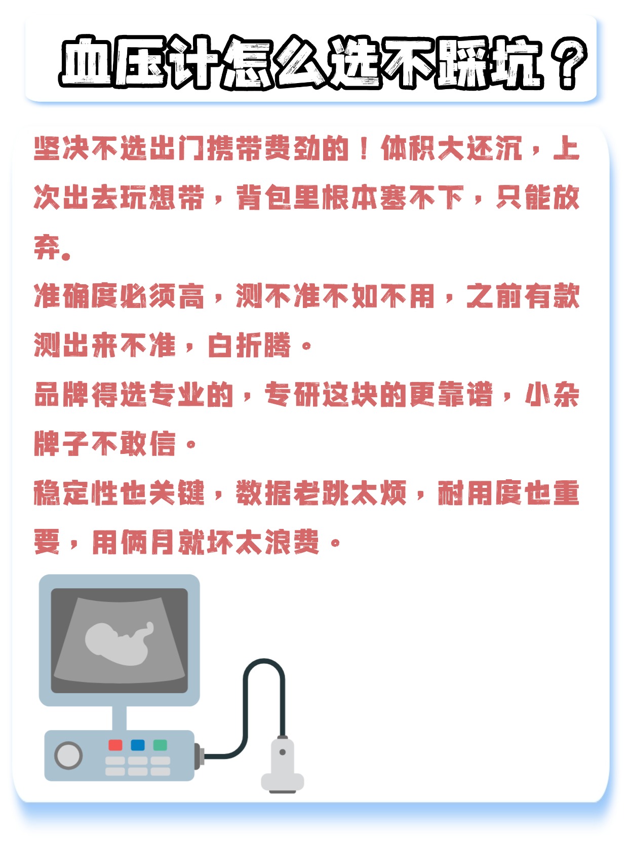 不少朋友问家庭电子血压计该怎么选,还关心上臂式血压计到底准不准确,今天就从实用角度给大家解答这些问题。首先说家庭用电子血压计的选择,毫无疑问优先选上臂式,原因很简单,它的测量稳定性更好,受外界因素干扰小,不管是年轻人还是老人操作,只要遵循基本的测量规范,就能得到有参考价值的数值;而腕式的虽然小巧,但对测量姿势、环境温度的要求都很高,稍微不注意就会出现较大误差,不太适合家庭日常监测。然后说上臂式血压计的准度问题,只要是规范生产的产品,压力传感器误差都能控制在合理范围,日常监测完全够用,不用盲目追求所谓的“排行榜”靠前的产品,重点看产品标识是否齐全、售后是否有保障。还有测量时要注意,测前静坐5分钟以上,双脚平放地面,袖带与心脏齐平,连续测2到3次取平均值,这样结果更靠谱。下面是我总结的家庭电子血压计选购注意事项,干货满满,大家可以先点赞收藏,后续选购的时候直接参考。