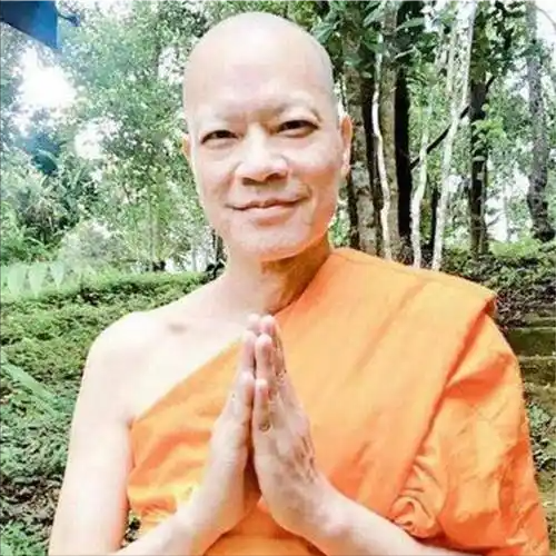 照片中的洪朝丰身穿一身黄金色的袈裟,原本茂密的秀发也剃成了光头,但是他在照片中笑的十分无忧无虑,十分的开心。