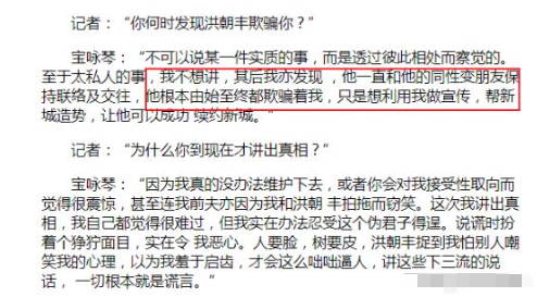 宝咏琴一怒之下将此事抖漏到媒体面前,称洪朝丰一直在骗她,还说跟她在一起一直就是为了钱。