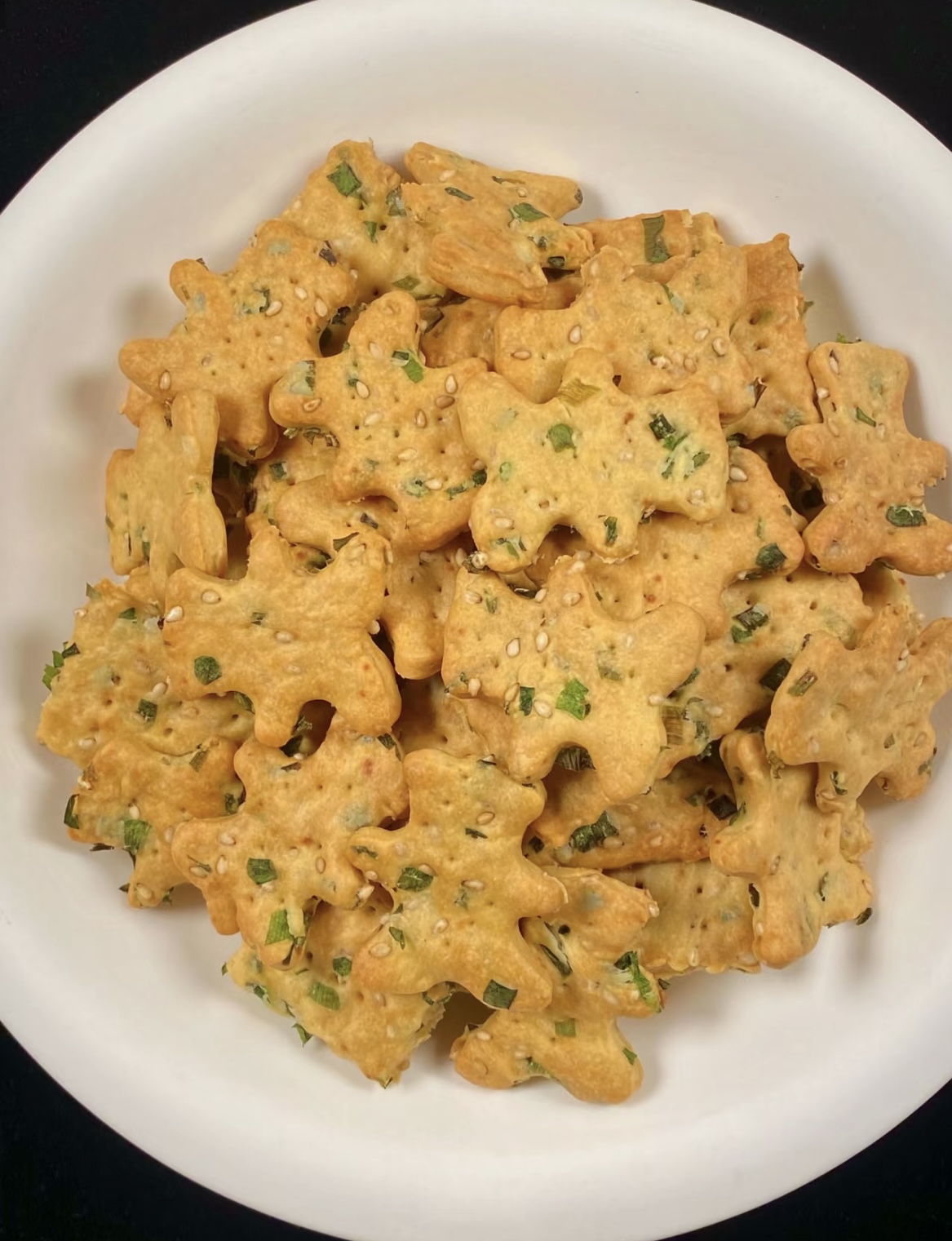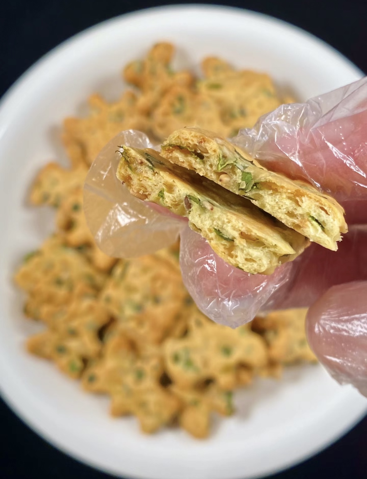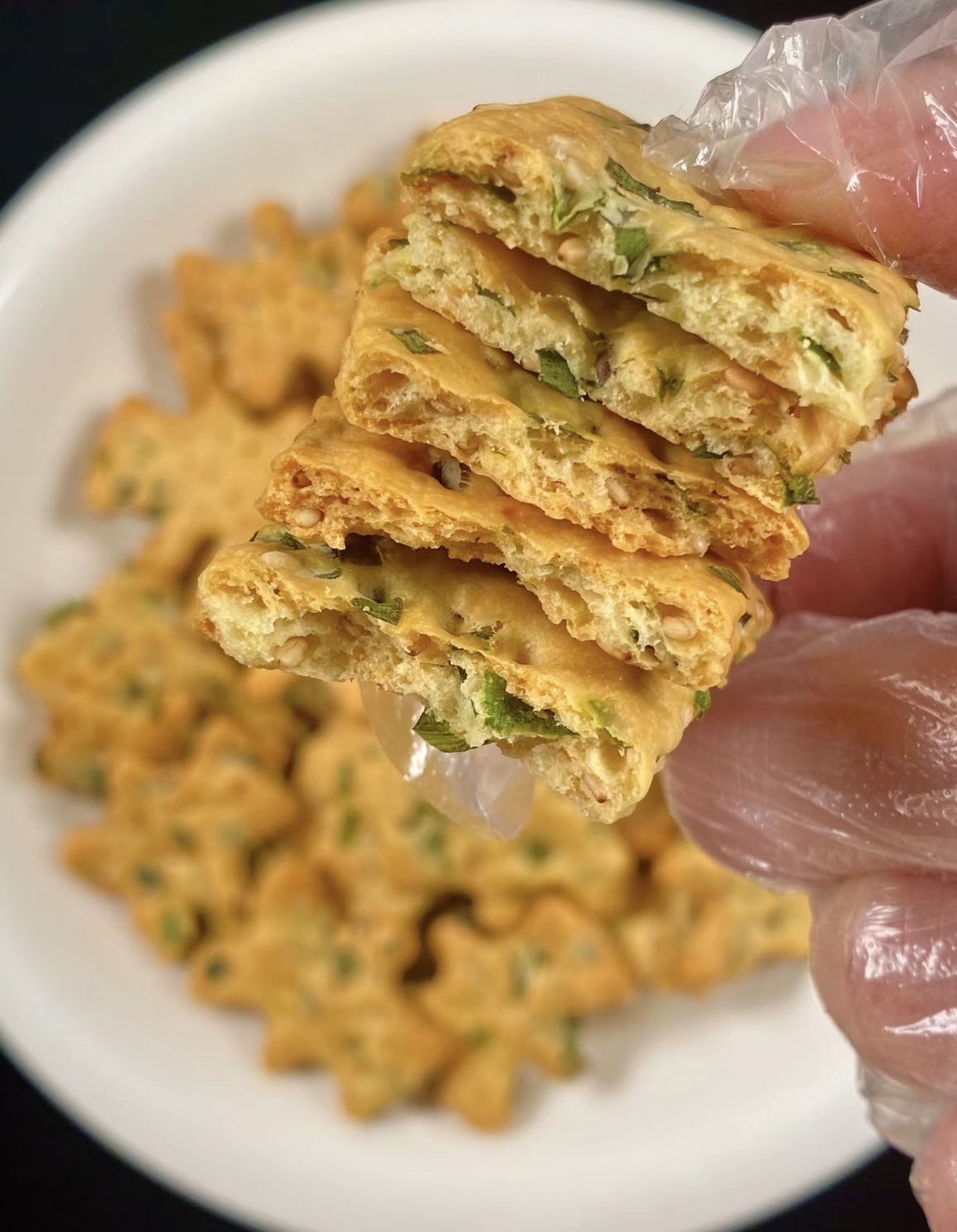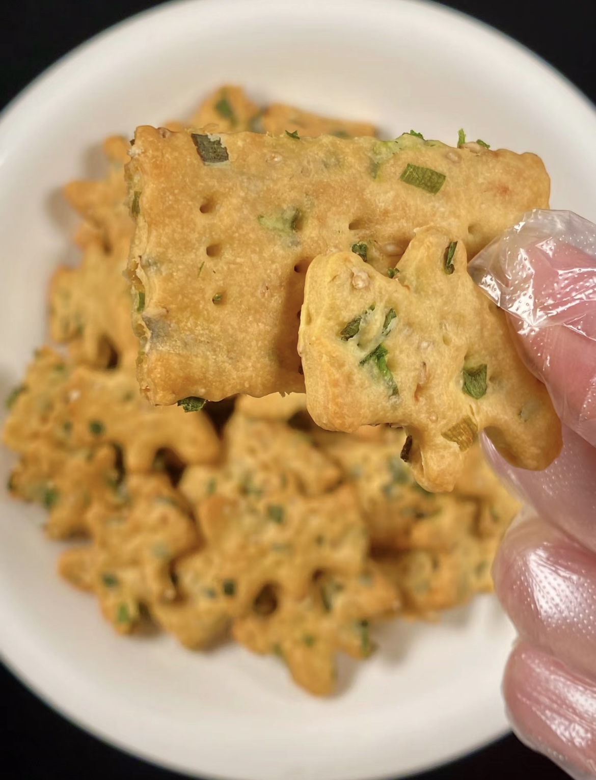 🎉 现在,你的葱香苏打饼干就做好了!你可以尝一尝,是不是外酥里嫩、咸香可口、葱香四溢呢?这款饼干不仅是追剧的小零食,也是送给朋友和家人的美味小礼物。快来试试吧,相信你的家人和朋友都会喜欢的!