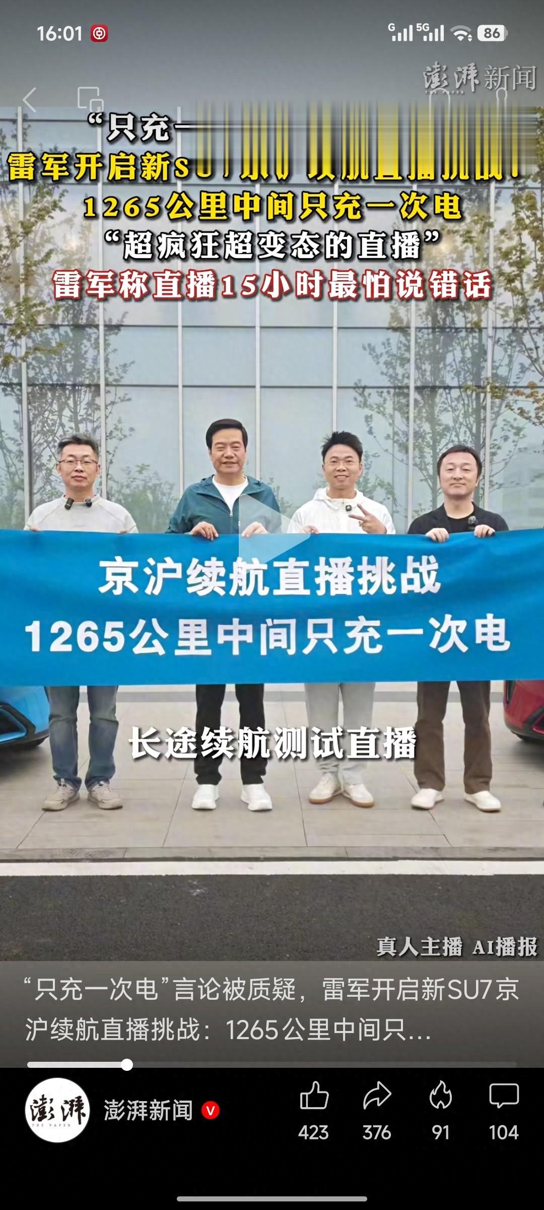 据澎湃新闻等媒体报道,雷军驾驶新款小米SU7完成京沪长途续航直播挑战,全程约1265公里,中途仅充电一次,引发全网热议。不少网友对“只充一次电”的表述产生误解,甚至质疑数据有水分。事实上,雷军的说法清晰严谨、毫无问题,出发前满电、途中仅补能一次,完全符合正常表述逻辑,不必过度解读与苛责。
