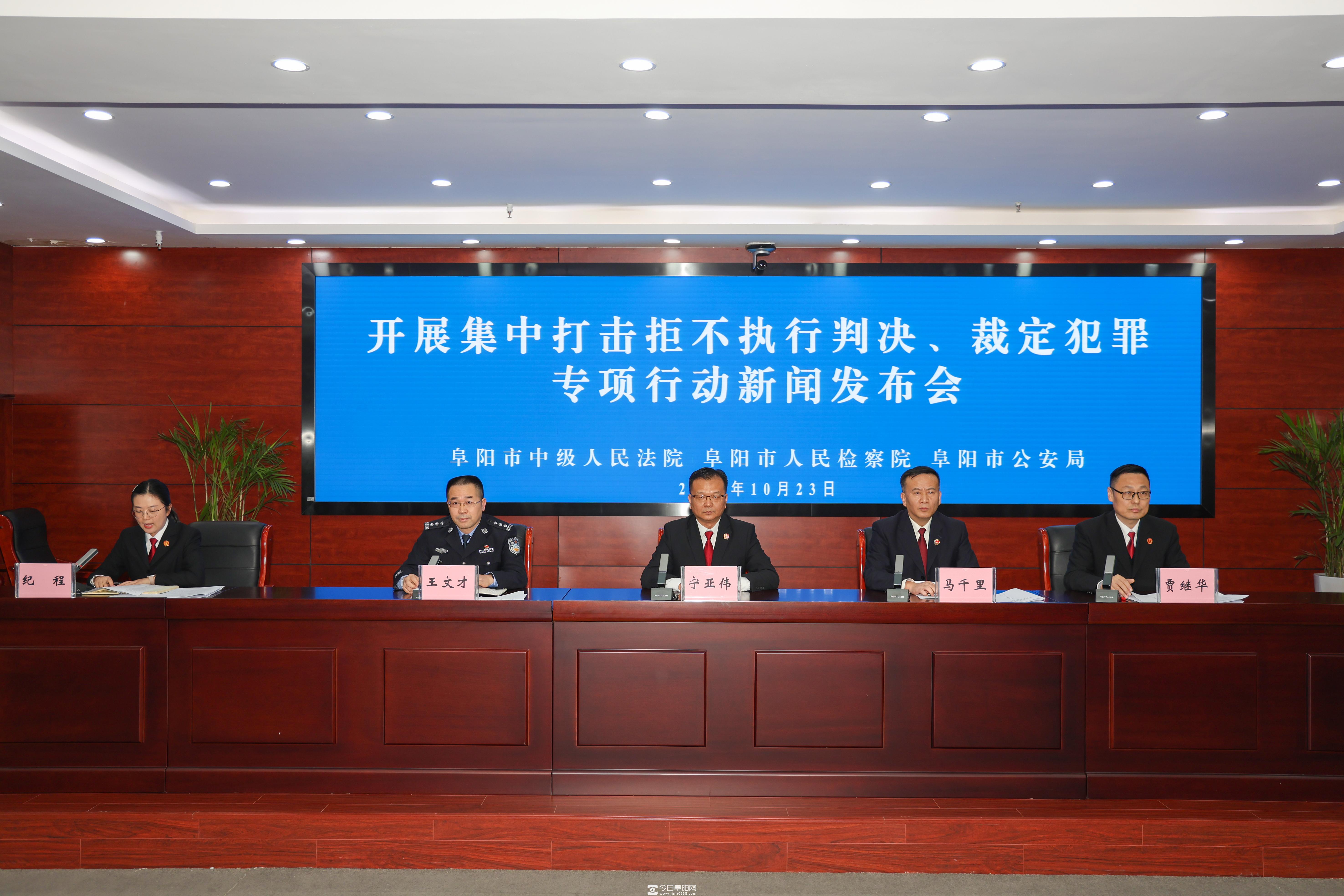 法律的生命在于实施,司法的权威在于执行。10月23日,阜阳市中级人民法院、阜阳市人民检察院、阜阳市公安局联合召开新闻发布会,明确将在全市范围内开展为期一年的集中打击拒不执行判决、裁定犯罪专项行动。