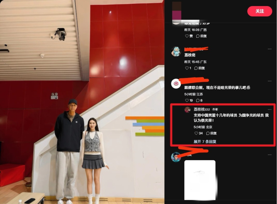 这位球迷晒出合影之后,评论区就有很多人发各种各样的图片,提到之前的绯闻,有黑粉留言“现在跟易建联合影,不是什么光荣的事吧”。这位美女球迷直接回怼道“支持中国男篮十几年的球员,支持为国争光的球员,我认为很光荣。”这话说的有理有据,易建联为中国男篮国家队征战了十几年,在篮球领域确实做到了为国争光。单就这一点,跟他合影难道不应该感到有些光荣?绯闻是绯闻,贡献是贡献,不能混为一谈。