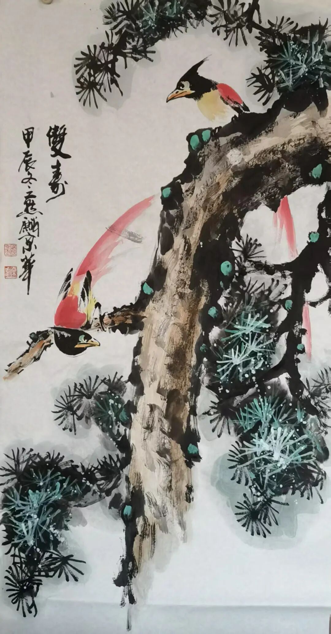 现场我们看到京华的两幅作品,《双寿》以松、绶带鸟为题材,松象征长寿,绶带鸟寓意吉祥,紧扣“双寿”吉祥主题。笔墨上工写结合,松树墨色浓淡展现苍劲,松针层次丰富;绶带鸟色彩艳丽,羽毛纹理通过笔墨变化生动呈现,兼具写实精度与写意气韵,是传统吉祥文化与精湛笔墨技法的融合。