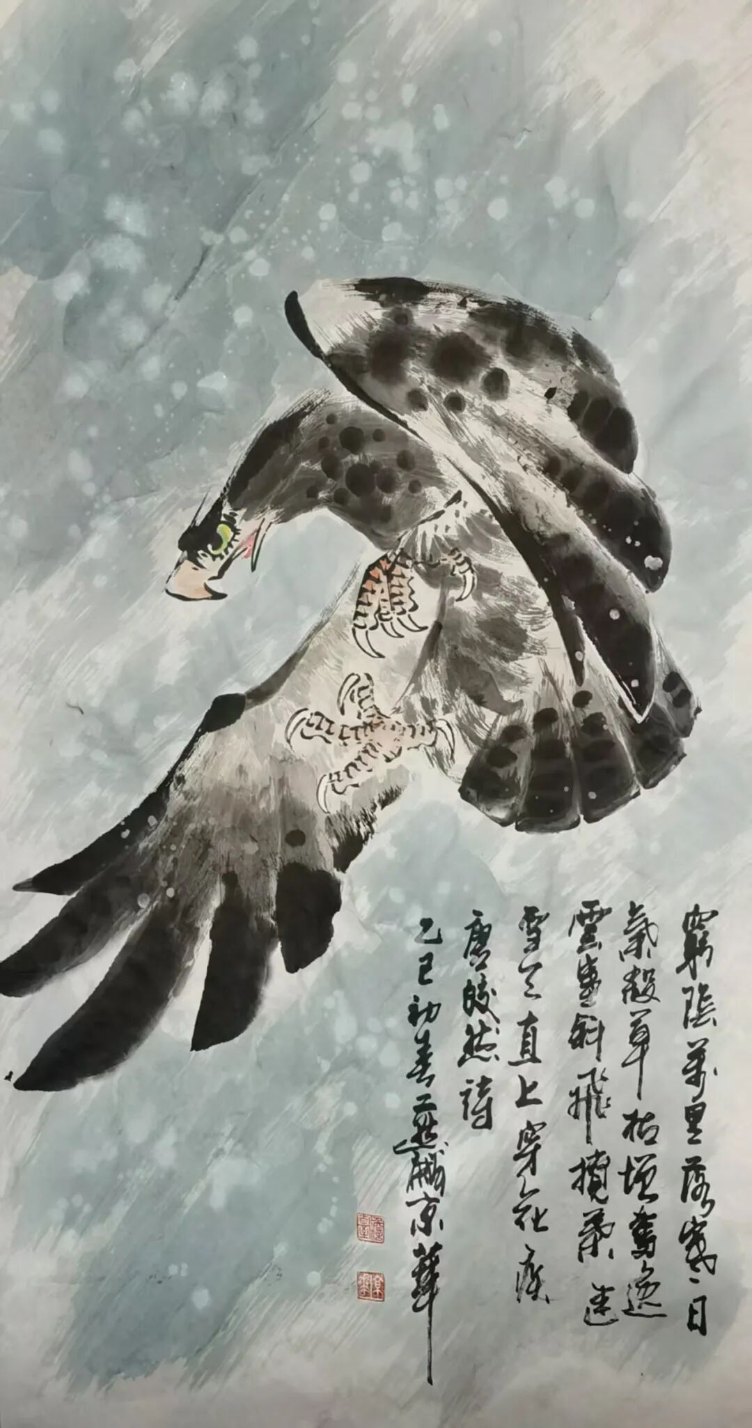 雄鹰:鹰喻力量与志向,画面中鹰姿态矫健,翅膀墨色浓淡对比强烈,尽显雄健气势。诗画结合,配廖映然诗作,提升文化内涵,传承了文人画诗书画一体的传统。