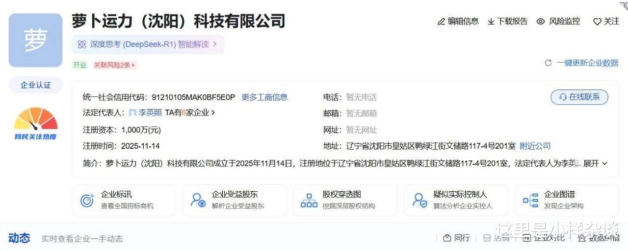 萝卜运力(沈阳)科技有限公司成立于2025年11月14日,注册地位于辽宁省沈阳市皇姑区鸭绿江街文储路117-4号201室