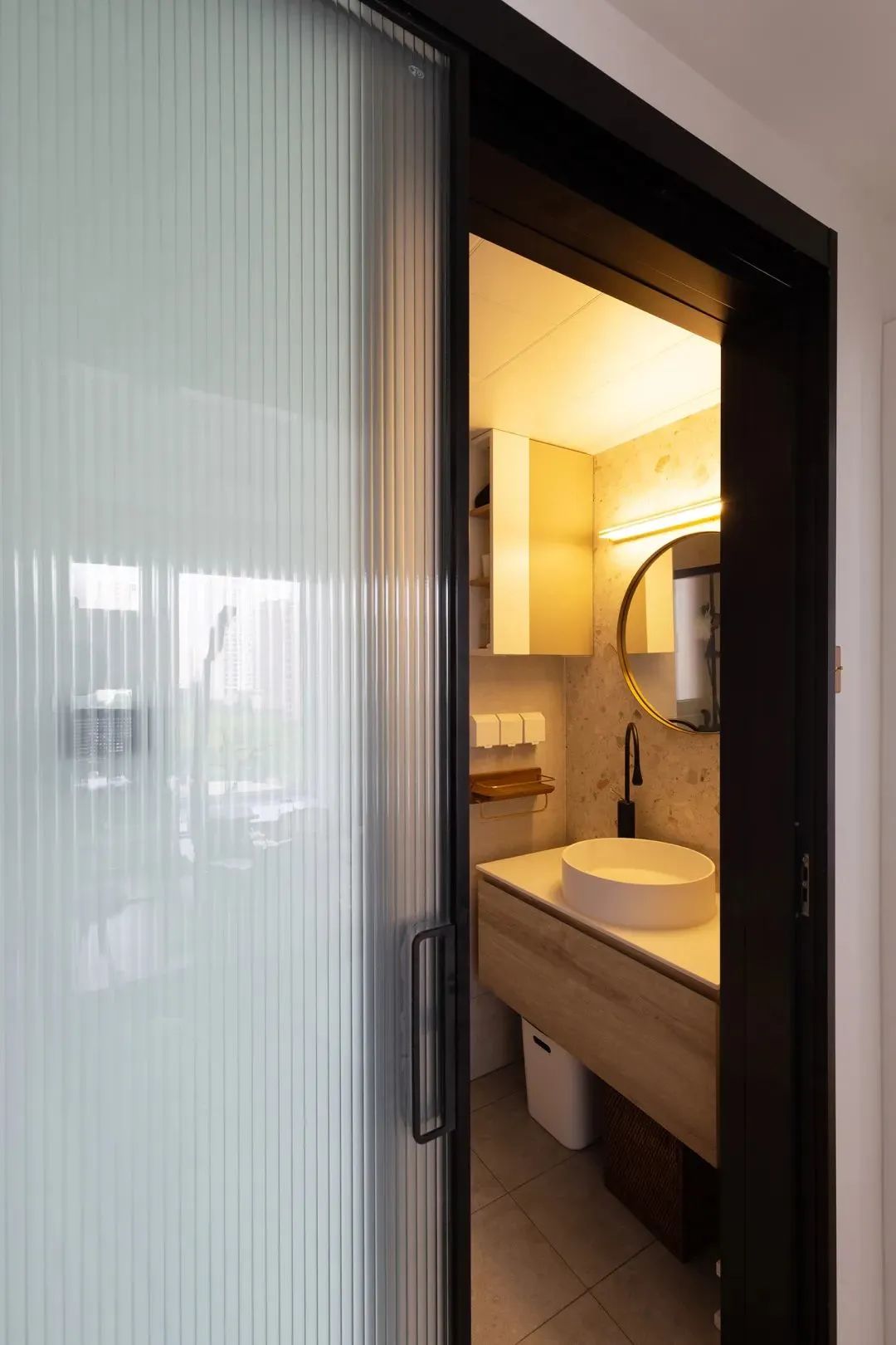 用玻璃推拉门做干湿分离,避免洗澡后地面积水,保持空间干爽;