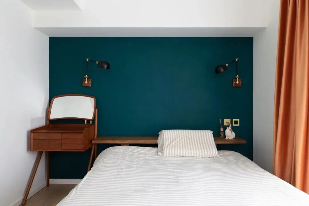 床头背景墙刷墨绿色,搭配橘色窗帘,两种颜色碰撞出复古优雅的氛围,既打破了空间单调,又能让人放松,提升睡眠质量。