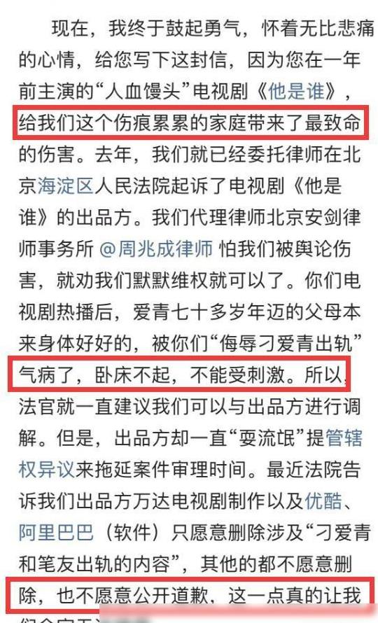 诉讼的过程往往繁琐而漫长,家属的诉求核心在于希望剧集能够停止播出并对其造成的伤害进行道歉。