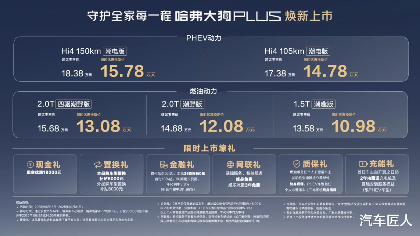 此次上市的 哈弗大狗 PLUS 提供 1.5T 燃油、2.0T 燃油和 1.5T 插混三种动力选择,共 5 款配置车型。限时换新价 10.98 万元起,配合 24 期 0 息金融方案和至高 8000 元置换补贴,让这款诚意之作的门槛大幅降低。正如 “狗是人类最好的朋友” 从不以身价衡量,哈弗大狗 PLUS 用越级配置和亲民价格,诠释着 “良心工程” 的真谛。