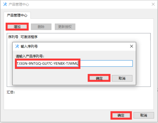7、点击【增加】,输入序列号:TJ3GN-9NTGQ-GLF7C-YEN8X-TJWML,点击【确定】。