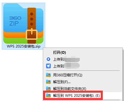安装步骤:1、得到压缩包之后,鼠标右键解压,点击【解压到WPS 2025安装包】。