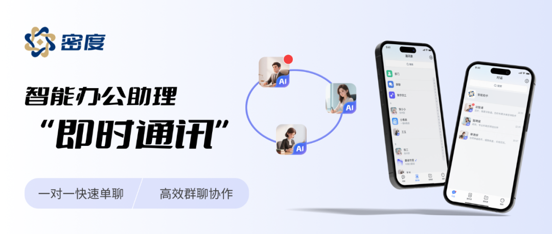 密度智能办公助理的即时通讯功能,将“沟通-资源-数据-场景”深度整合。通过覆盖多对象、多内容、多设备、多场景,帮助企业缩短信息流转时间,让办公协作更高效、更有序。