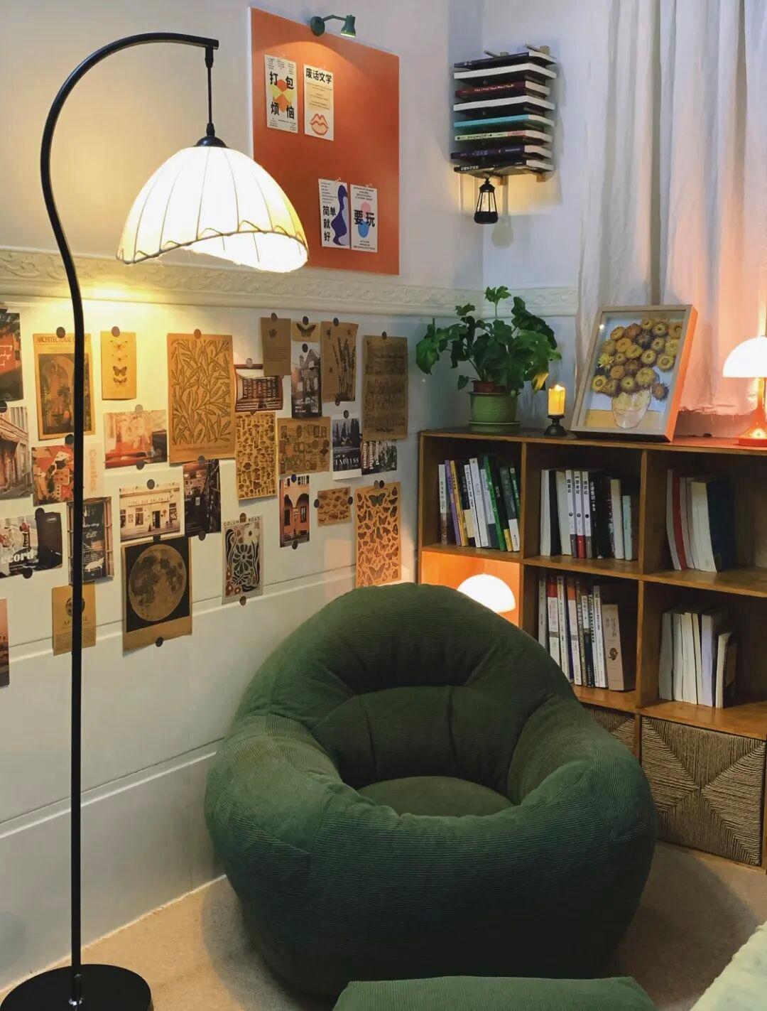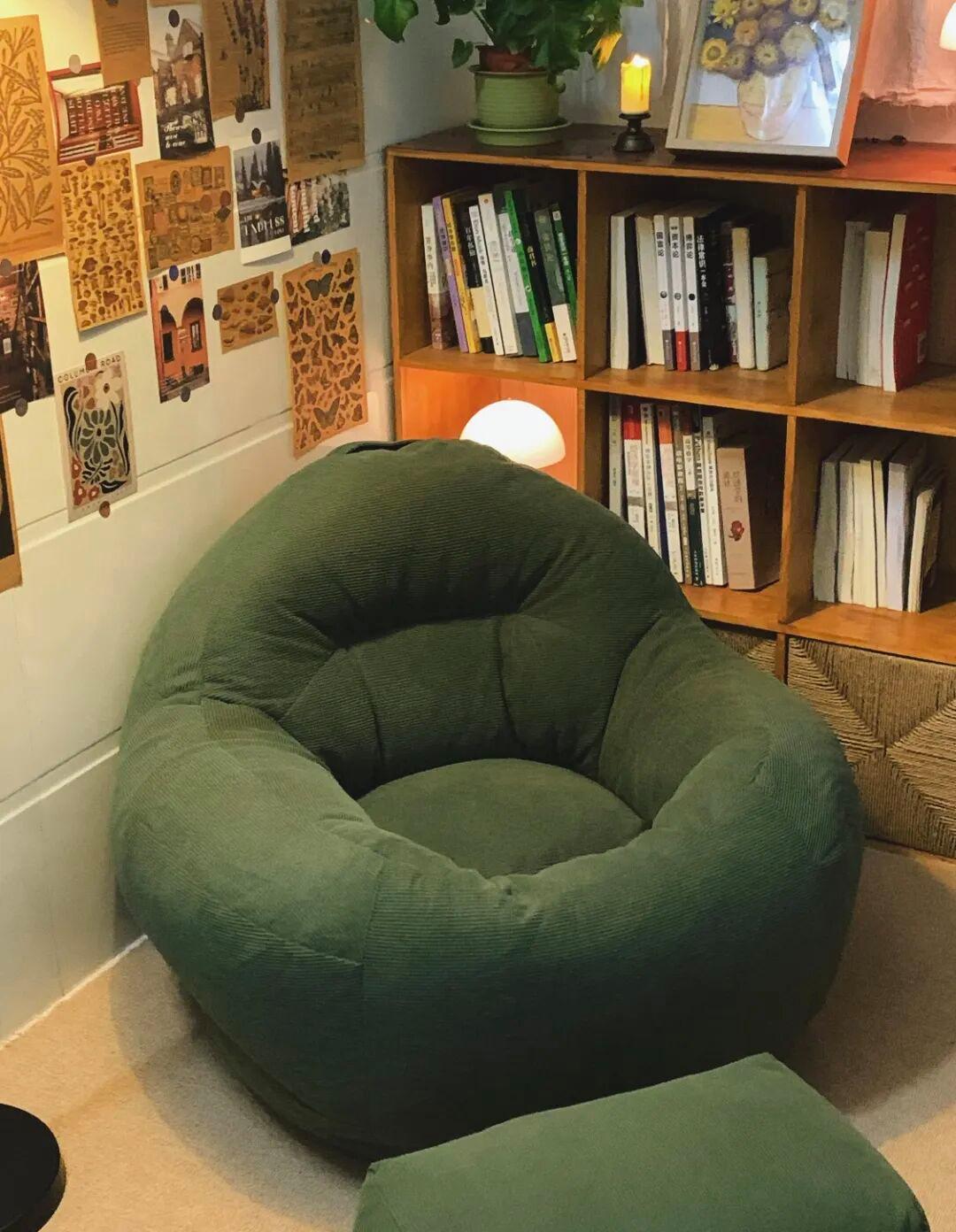 靠墙放置一个懒人沙发,半躺着真的好舒服,而且家具整体材质要一致,可以原木材质的,而且颜色也是保持一致;