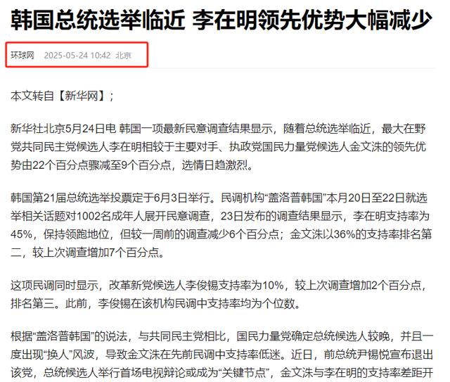 信源:环球网 2025年5月24日 关于“韩国总统选举临近 李在明领先优势大幅减少”的报道
