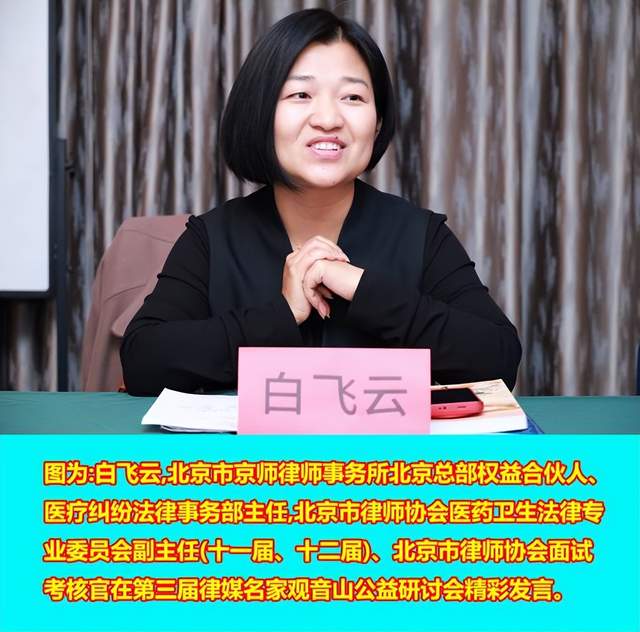 白飞云,北京市京师律师事务所北京总部权益合伙人、医疗纠纷法律事务部主任,北京市律师协会医药卫生法律专业委员会副主任(十一届、十二届)、北京市律师协会面试考核官。