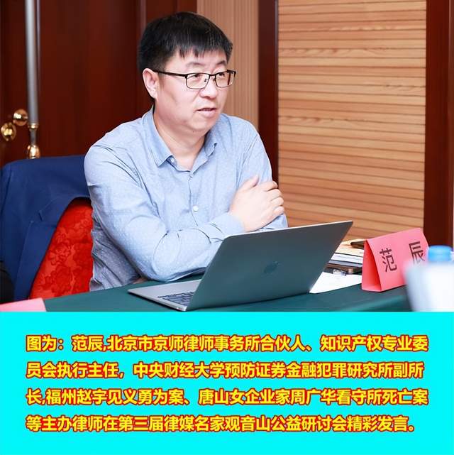 范辰,北京市京师律师事务所合伙人、知识产权专业委员会执行主任,中央财经大学预防证券金融犯罪研究所副所长,福州赵宇见义勇为案、唐山女企业家周广华看守所死亡案等主办律师。