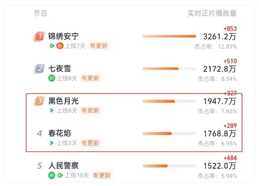 尽管《黑色月光》各种数据都比《新闻女王》好,但它却没能压制同期播出的内地剧《锦绣安宁》和《七夜雪》。