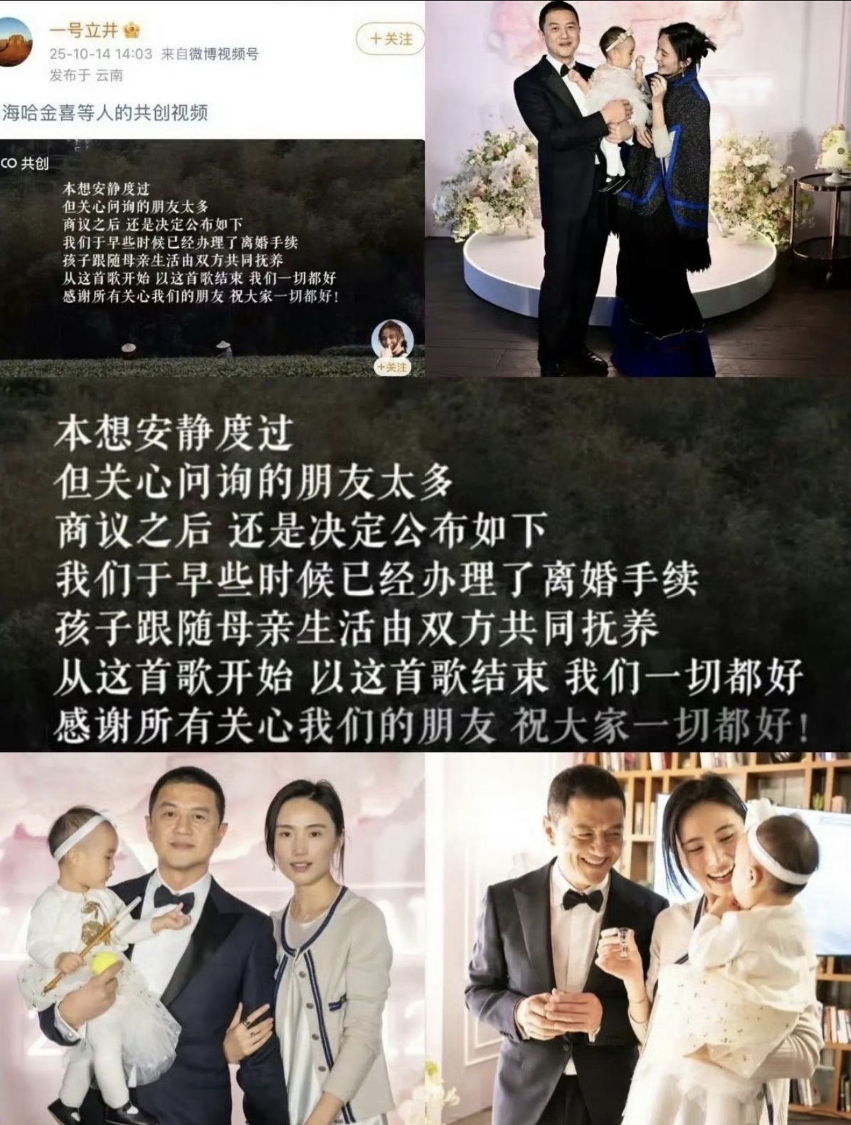此次离婚声明中,两人强调“孩子跟随母亲生活,由双方抚养”,被网友解读为“体面分手天花板”。毕竟,李亚鹏前妻王菲当年离婚时,就因“家族信托避债”被赞“人间清醒”,如今海哈金喜虽没王菲的财力,但“共同抚养”的表态也算给足面子。