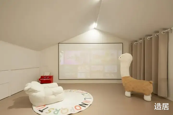 影音室:打造时可选遮光窗帘,墙面贴吸音棉减少杂音,放一张 L 型懒人沙发,沙发底下藏充气床垫,客人来了也能快速铺开。