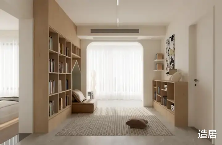 收纳:书架建议做半开放 + 半封闭,开放区放常看的书;封闭区存行李箱、备用床品,客人来了直接拿。
