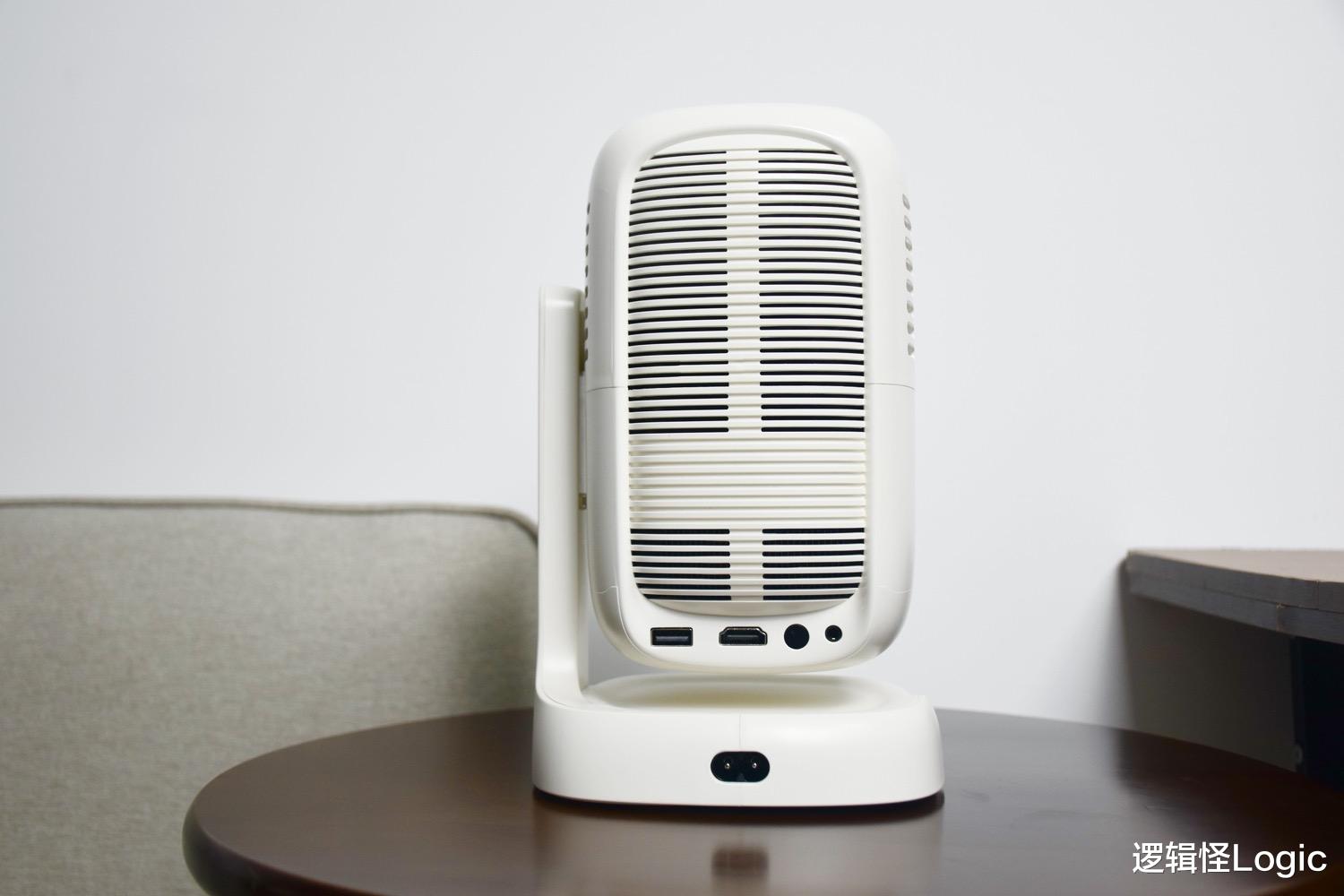 投影仪背部配备了USB接口、HDMI接口、3.5mm音频接口、电源接口,能够满足多设备连接需求。无论是连接Switch、笔记本,还是外接音响系统,都能轻松实现。值得一提的是,电源接口和电源按键并未设在机身上,而是巧妙集成在云台底座上,这样的设计不仅让机身更简洁,也避免了接线后影响云台旋转调节的尴尬。