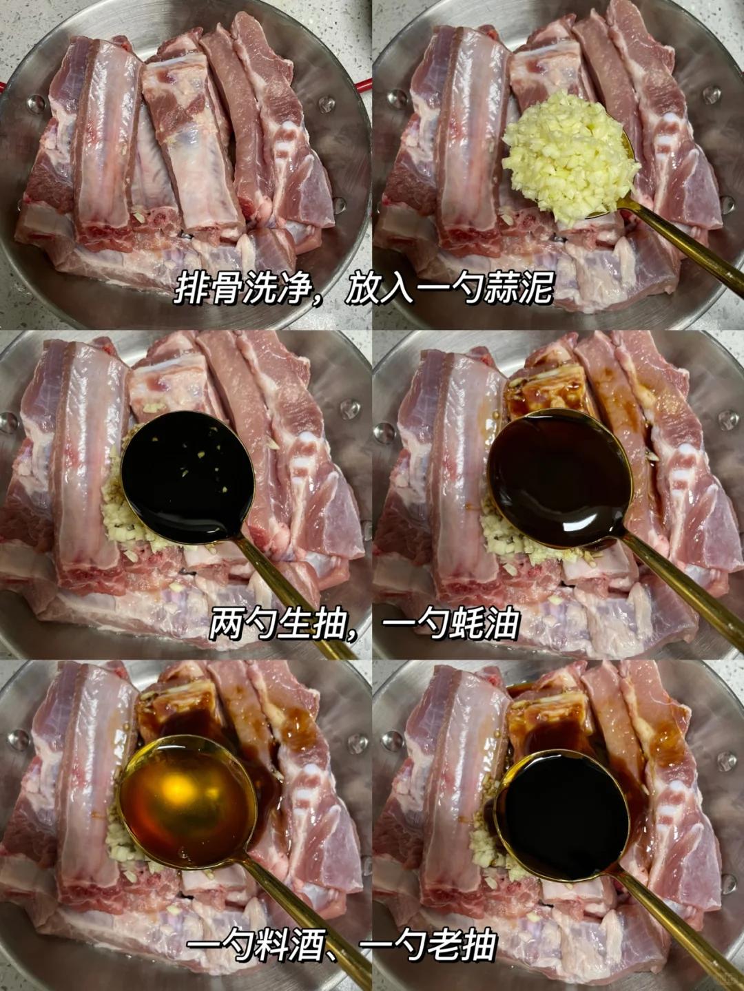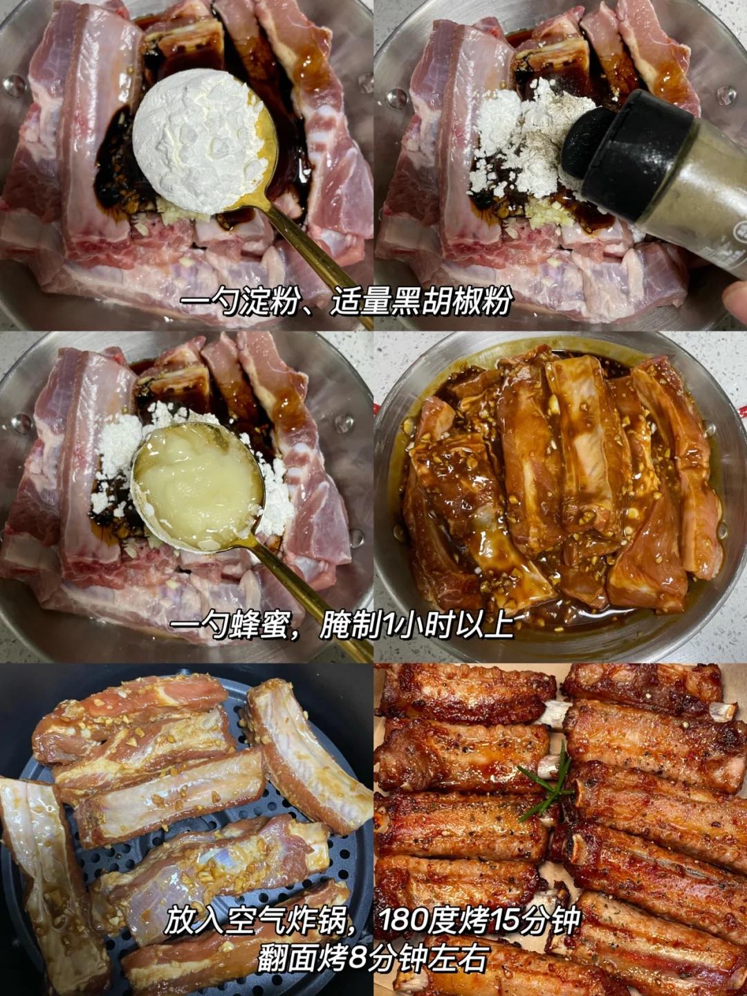 排骨洗净沥干水分,放入一勺蒜泥、两勺生抽、一勺蚝油、一勺料酒、一勺老抽、一勺蜂蜜、一勺淀粉、适量黑胡椒抓匀腌制1个小时以上入味;