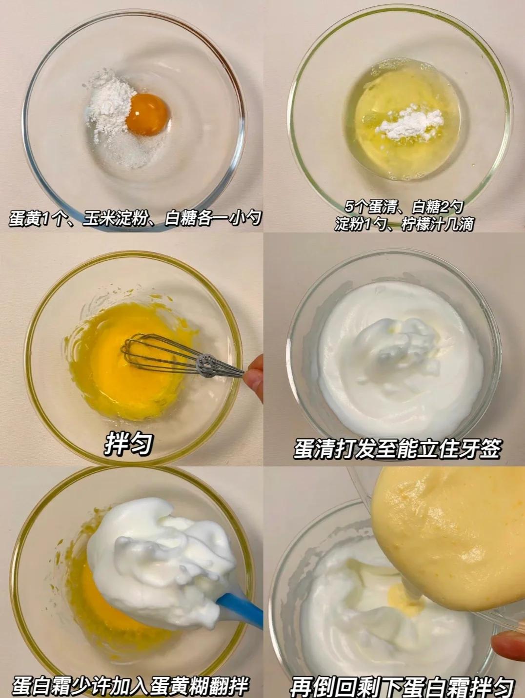 蛋黄1个、玉米淀粉、白糖各一小勺,5个蛋清、白糖2勺、淀粉1勺、柠檬汁几滴搅拌均匀;