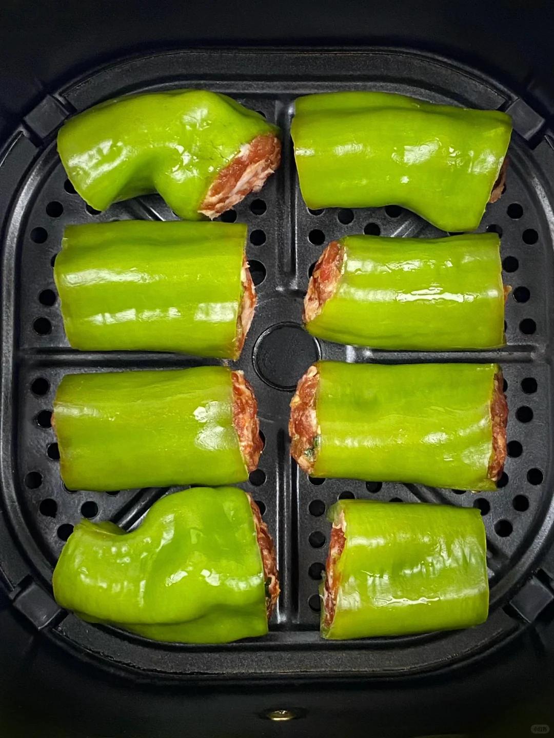 虎皮尖椒切段去籽,塞入肉沫,空气炸锅180度16分钟,中间记得翻面哦!