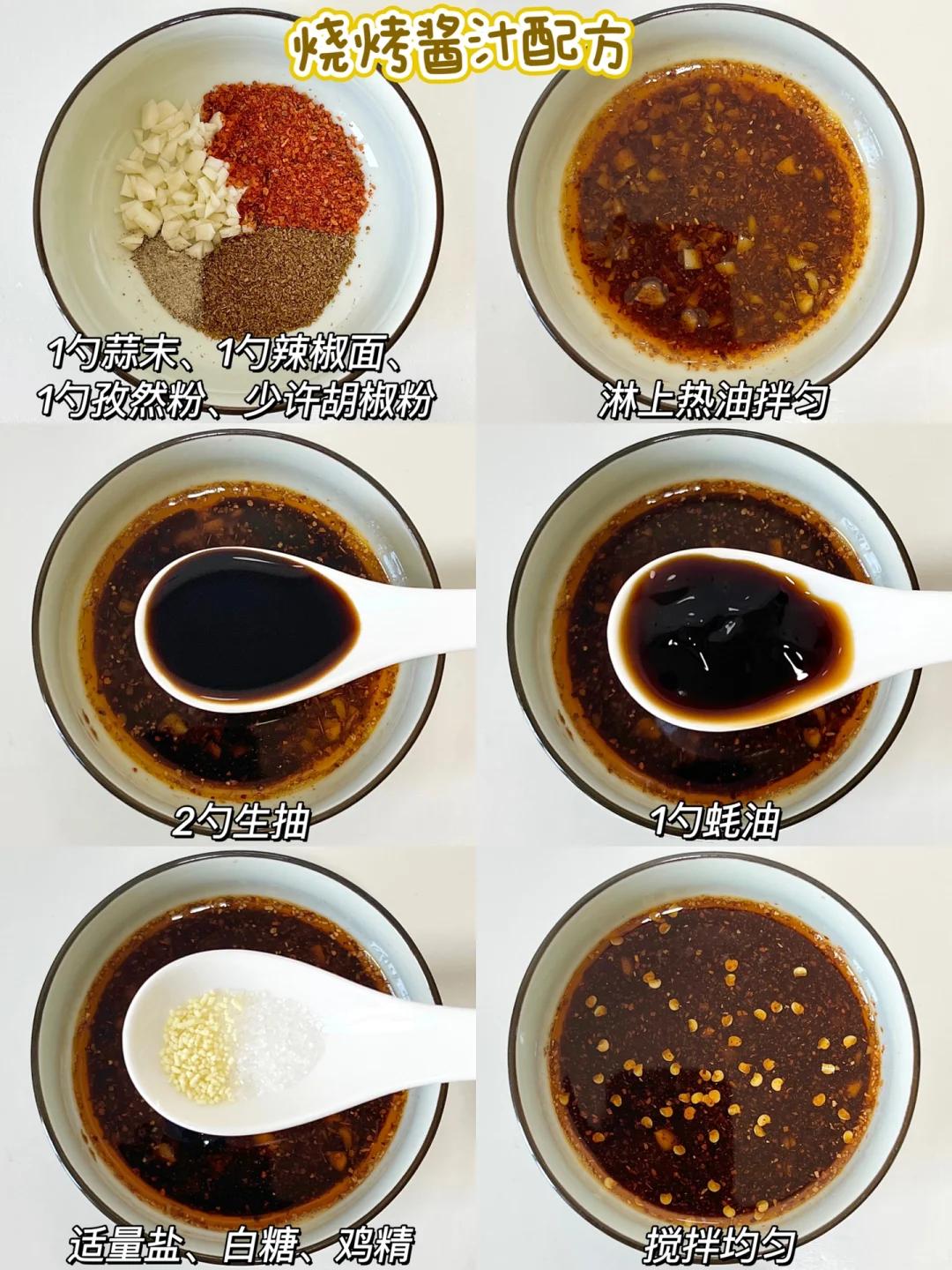 1勺蒜末、1勺辣椒面、1勺孜然粉、少许胡椒粉,淋上热油拌匀,加入2勺生抽、1勺蚝油、适量盐、白糖、鸡精搅拌均匀;