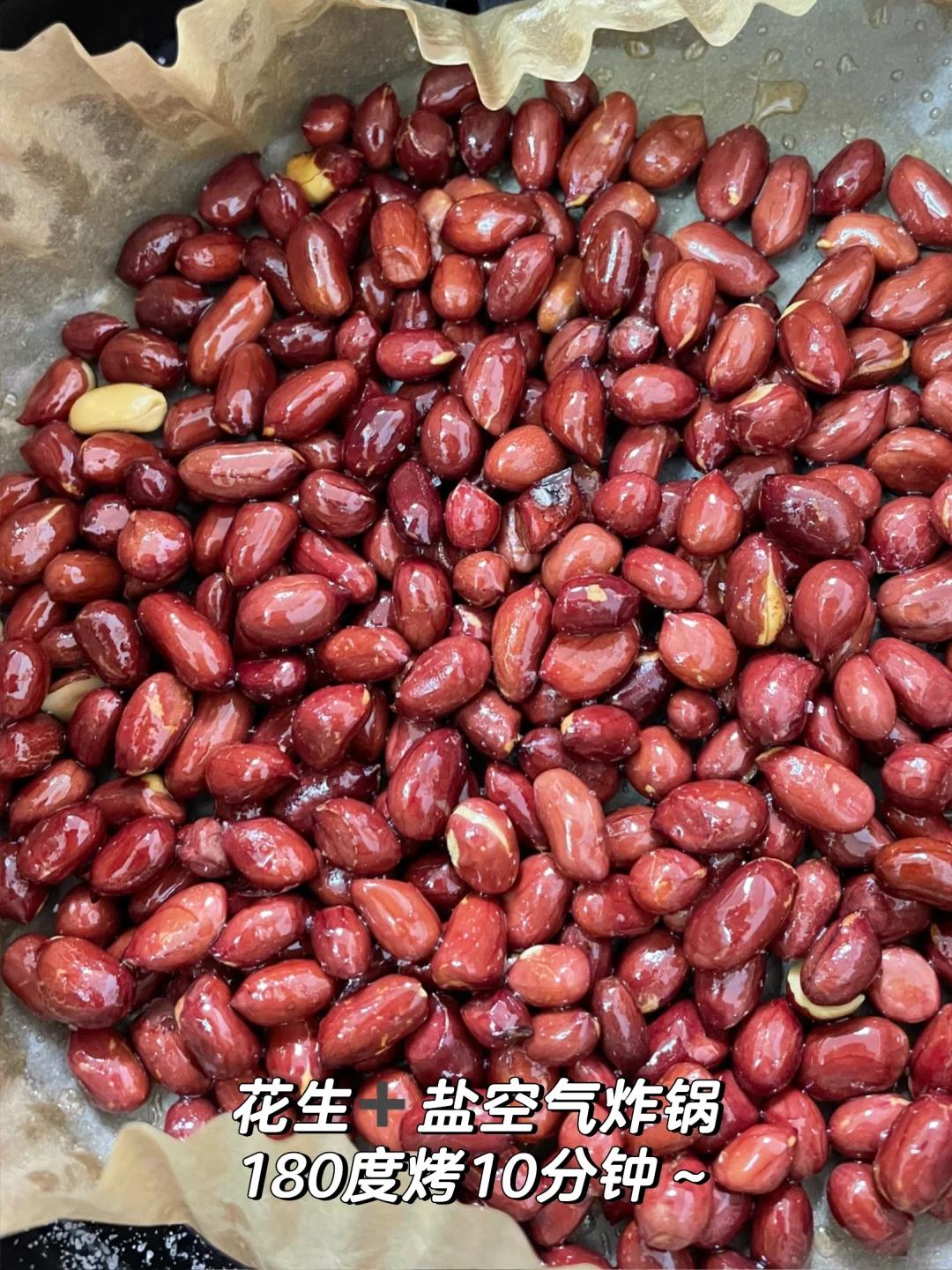 花生放点油+盐,空气炸锅180度左右烤10分钟,每隔5分钟注意翻面,有些炸锅脾气不好,温度高了容易焦发苦。