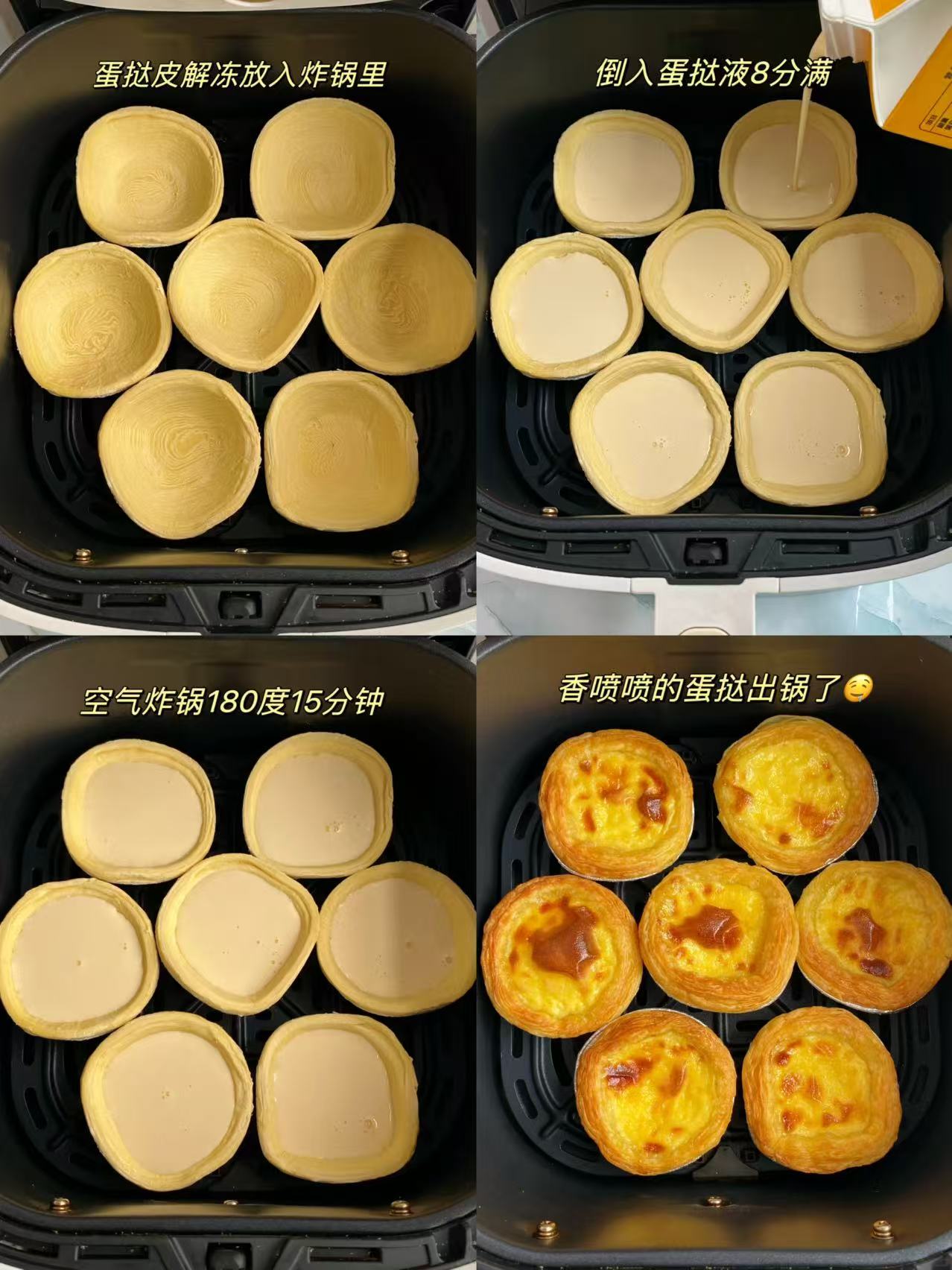 蛋挞皮解冻放入空气炸锅,倒入调配好的蛋挞液8分满,空气炸锅180度预热15分钟出锅啦!