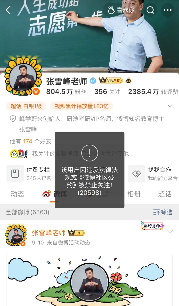 9 月 24 日上午,有网友发现教育领域知名自媒体人张雪峰的多个社交平台账号状态异常。其中,微博账号 “张雪峰老师”(粉丝数 1287 万)、快手账号 “张雪峰考研”(粉丝数 865 万)、B 站账号 “张雪峰工作室”(粉丝数 423 万)均被标注 “禁止关注”,点击关注按钮显示 “该账号因违反社区规定或相关法律法规,暂不支持关注”,其过往发布的内容仍可正常浏览,但无法进行评论、转发操作。