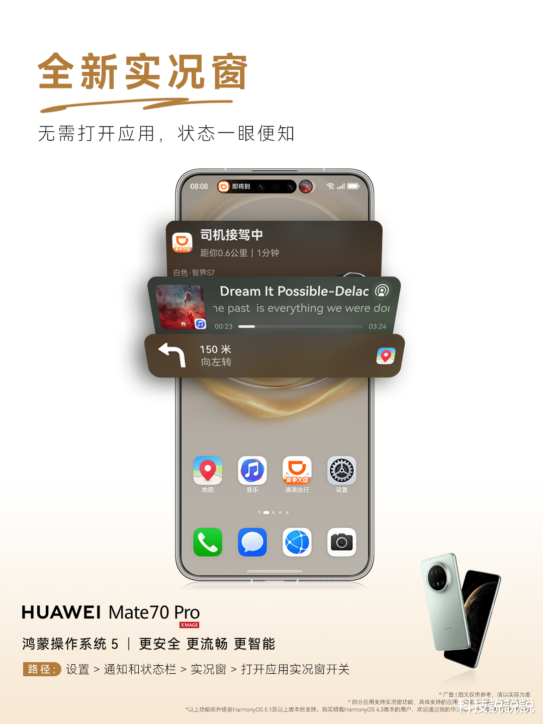 另外,华为Mate 70系列还升级了全新实况窗,如今无需打开应用,各类实时状态一眼便知。比如出行时,航班、高铁等信息,扫一眼实况窗就能轻松掌握。点外卖时,不用打开应用就能随时查看配送状态,使外卖等待过程更加直观、便捷。在抢票场景中,通过实况窗,直接就能即时知晓出票进度,抢票快人一步。