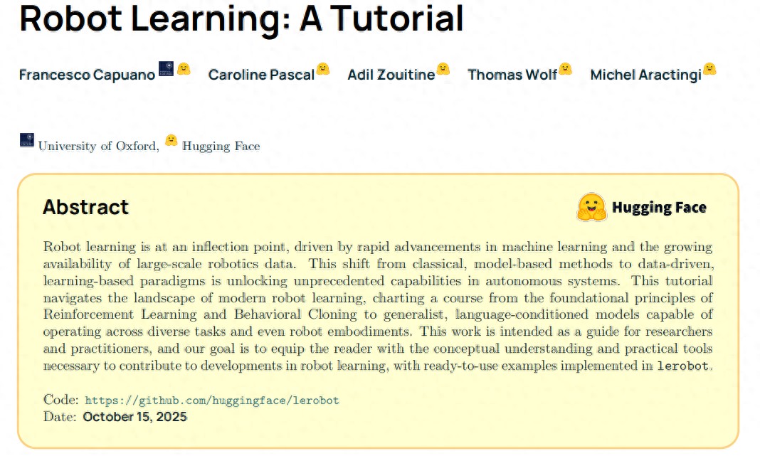 近日,Hugging Face 联合英国牛津大学团队发布了 LeRobot,这是一个旨在与整个机器人技术栈实现端到端集成的开源库,业内将其称为是「机器人界的 PyTorch」。LeRobot 支持机器人从大规模多模态数据比如文本、视频和传感器中学习,适配于多种硬件,助力于推动机器人技术从方程控制面向数据驱动泛化转变。