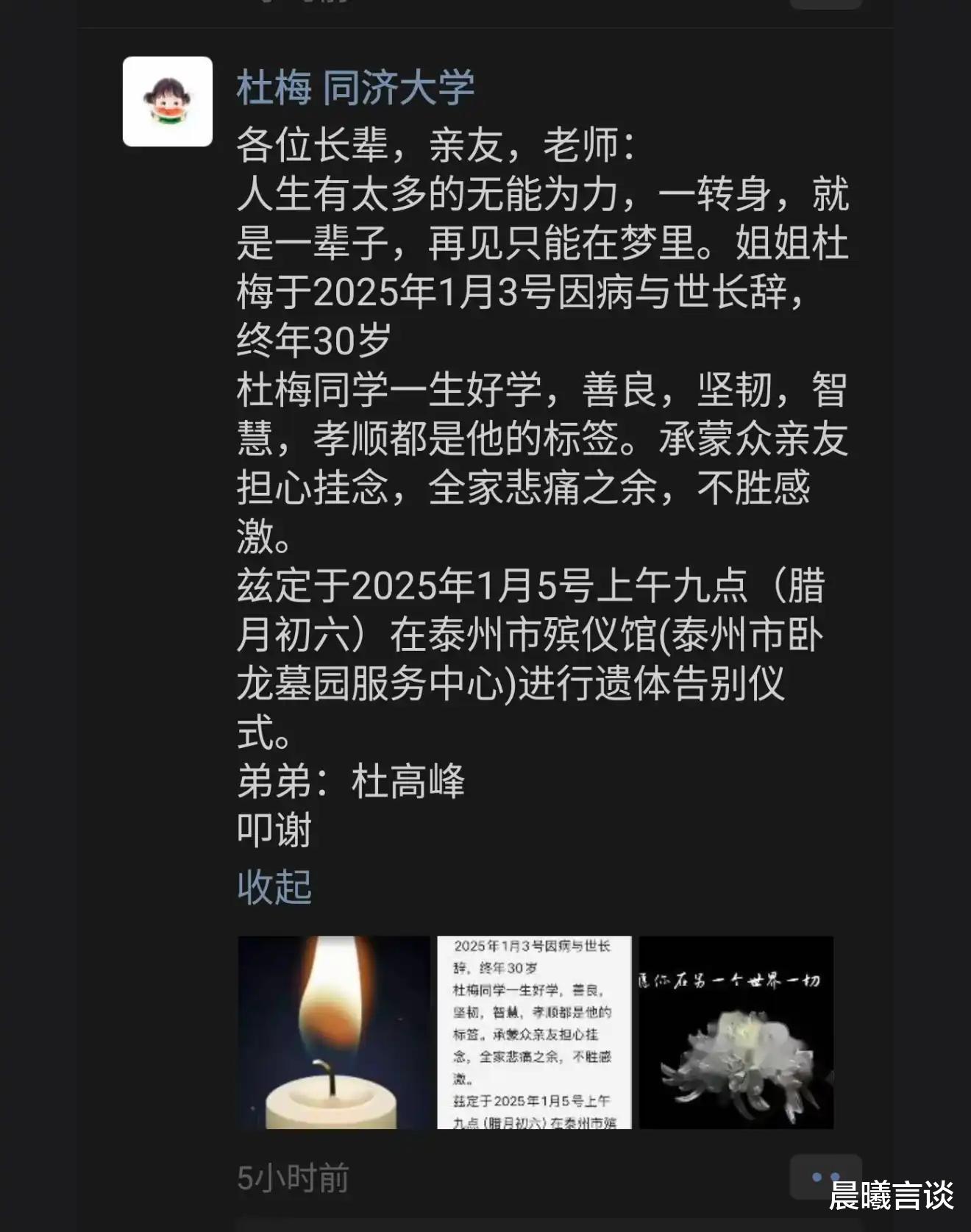 愿杜梅在天堂能够安息,也希望她的故事能够一直被铭记,成为更多人追求健康和幸福的动力和启发。