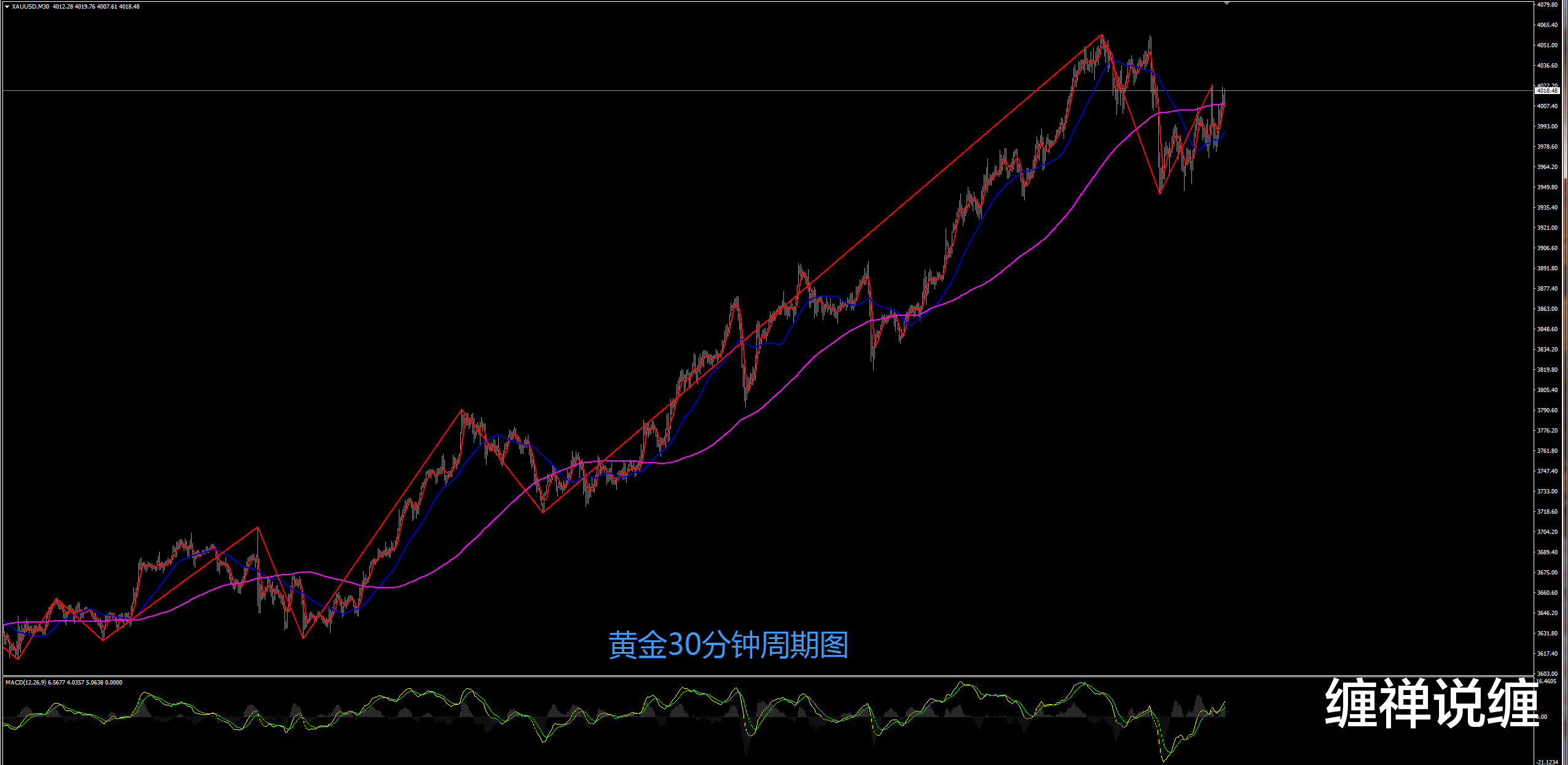 黄金30分钟下周如果不破3970,那么黄金30分钟可能开始延续上涨,下周黄金突破4023,那么黄金30分钟也还是延续上涨,现在黄金波动比较剧烈,下周如果延续剧烈走势,那么黄金可以等待回撤3970附近继续多,如果慢慢企稳,那么等稳定后再顺势多。黄金多头开始反击,下周能否再创新高?