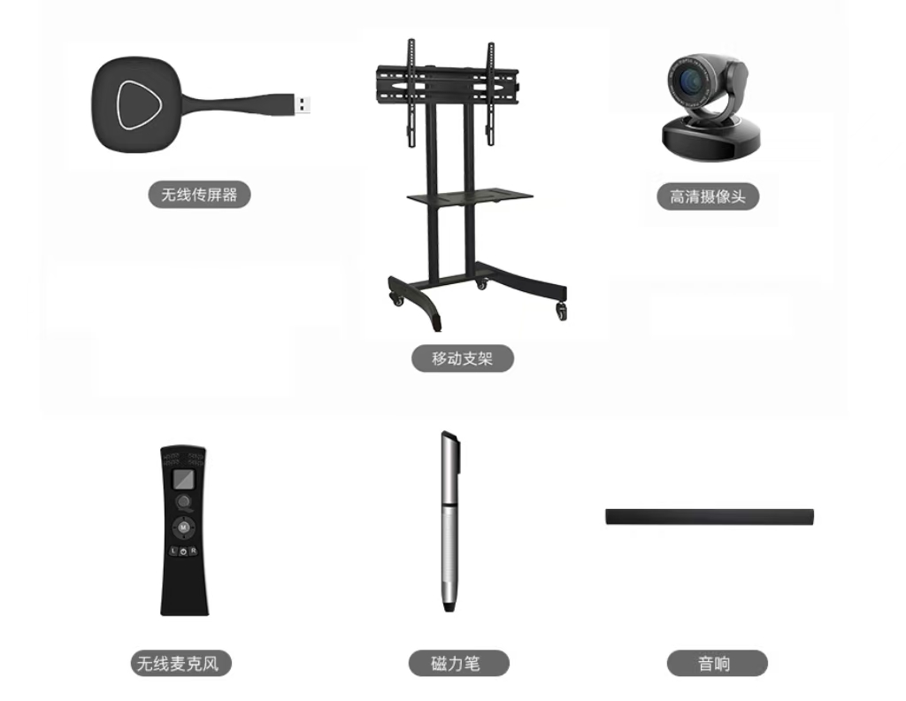 配备无线传屏器、移动支架、高清摄像头、无线麦克风、磁力笔等多种配件以供选择。全方位拓展会议一体机的使用场景。