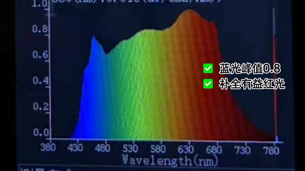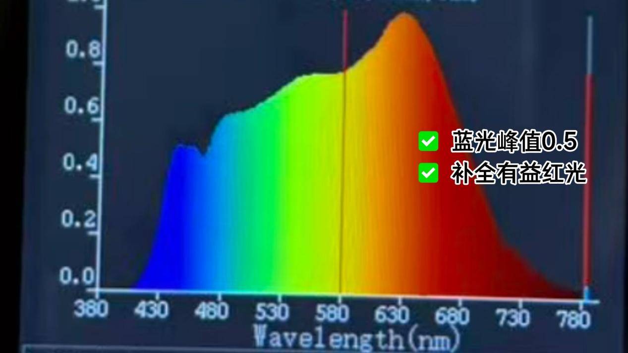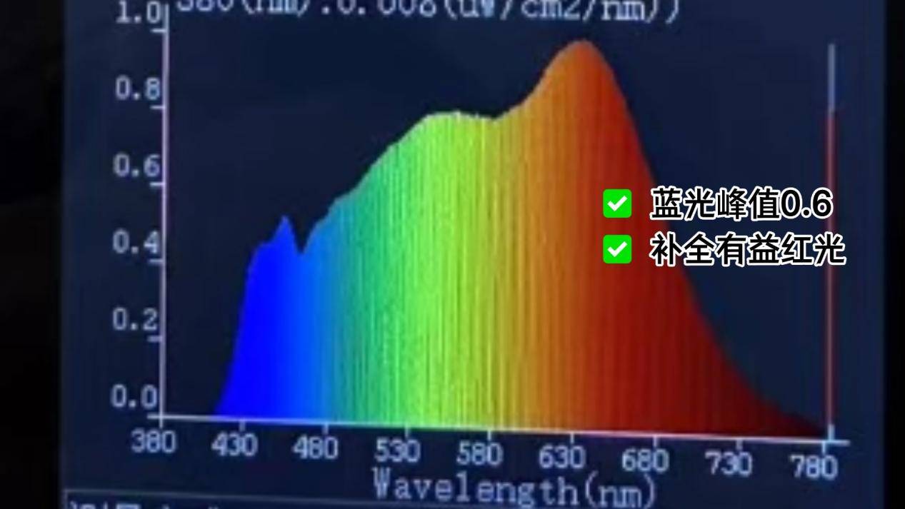 孩视宝配备全光谱LED,并采用蓝光激发全光谱技术,实测蓝光峰值约为0.7。值得一提的是,孩视宝在光谱中增强了680nm红光波段,且光线连续性良好,呈现出的照明效果自然柔和,整体观感舒适。