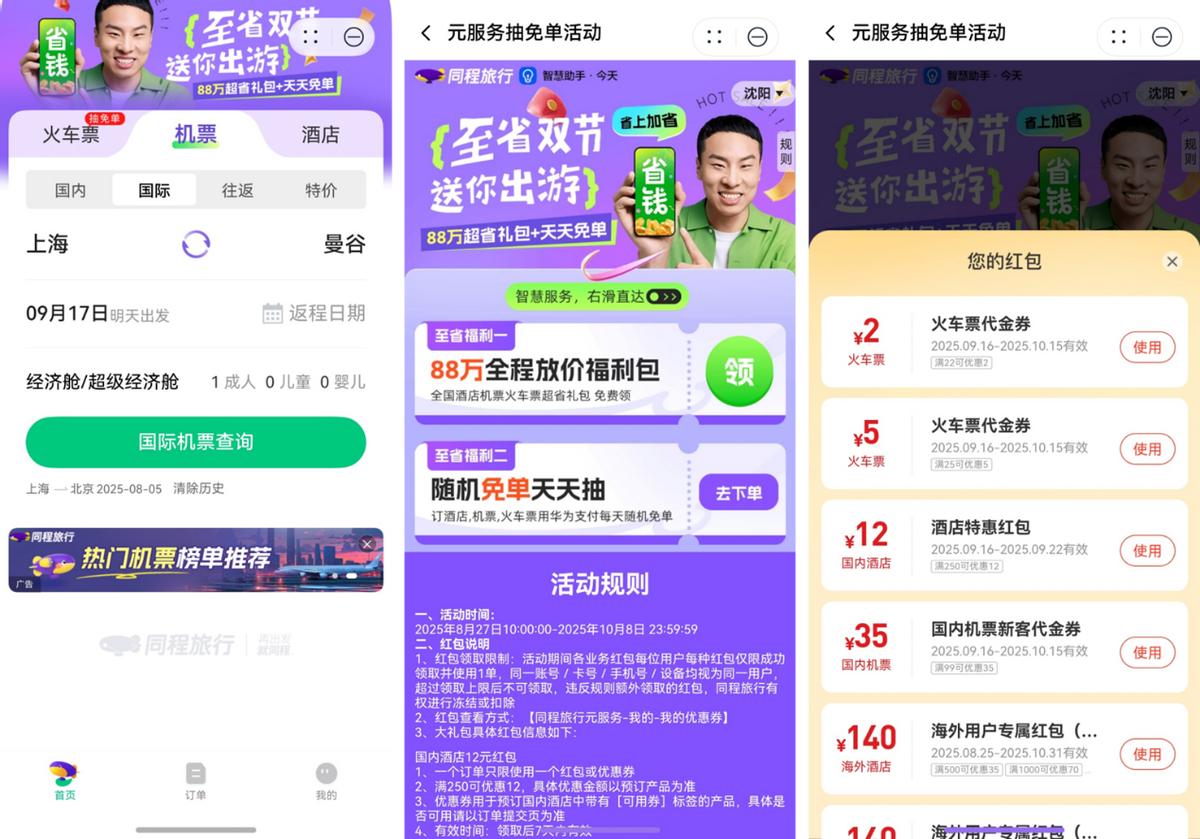 作为佛系选手,经常会突发奇想就立刻决定自己的假期行程,主打一个说走就走。这时候,华为负一屏也可以满足你随时的需求。手机桌面右滑进入负一屏找到同程旅行元服务,高铁票/机票/酒店一站式搞定,订票后同样会有出行动态卡片在负一屏顶端提醒,出行也毫不慌张。假期将至,同程旅行元服务也为鸿蒙用户们推出假期专享福利,有立减和免单活动可以参与, Pura X、 Pura80 、nova14三个机型的用户在负一屏“鸿蒙有礼”还可领取价值2900元的同程旅行白金卡。