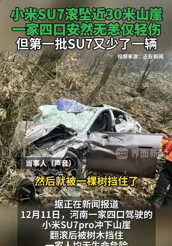 河南巩义市浮戏山景区上演了一出惊险场面。一辆才入手不到两个月的小米SU7pro,愣是玩起了跳水。这台12月11日在景区撒欢的新车,玩得有点大啊!这台刚从4S店提回来没多久的座驾(2024年10月24日提车),硬是给车主整出了一身冷汗。当时这台小米正在溜达下山,速度也就40码左右,结果莫名其妙就开启了越野模式,直接冲下山崖。这一跃可不是闹着玩的,整整腾空二三十米!要不是半路上碰到几棵英雄树拦了道,这趟山路十八弯还真说不准会演变成啥样。车是遭了罪,前排和右侧的气囊全都蹦出来凑热闹。