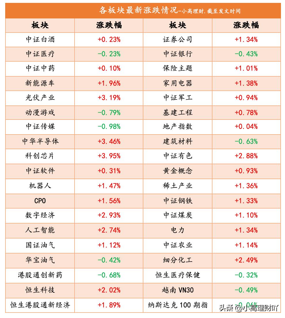 大金融板块涨跌分化,证券公司和保险板块涨超1%,银行逆势下跌。当避险情绪回落的时候,银行板块就很难再抢夺其他板块的流动性了。光伏和新能源车板块反弹上涨,市场资金也在慢慢朝着储能方向转移,小高最近在纠结要不要布局一个固态电池、储能方面的新基金?大家说说看!