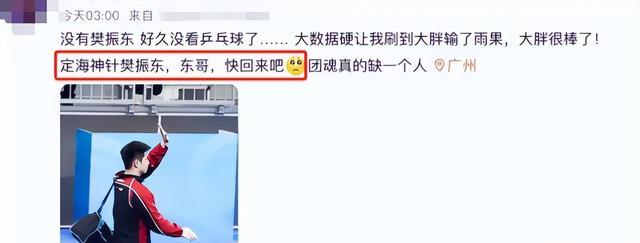昨天梁靖崑不敌雨果后,有球迷也是发文对大胖进行安慰,觉得他已经很棒了,同时也朝樊振东喊话:东哥,快回来吧!