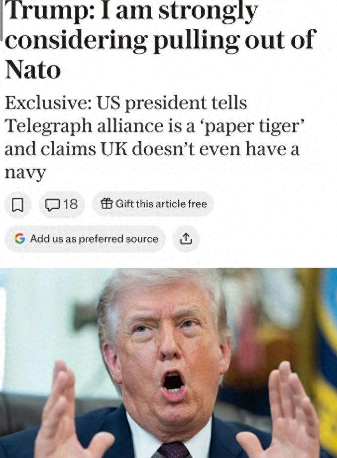 据英媒报道,美国总统特朗普在一次专访中将北大西洋公约组织比喻为“纸老虎”,自己正在认真考虑让美国退出北约。不仅如此,特朗普还将英国“单拎出来羞辱了一番”,声称“英国甚至没有海军”。我们知道,就在上周,特朗普还在一场内阁会议中提及英国皇家海军,称“英国航母就是玩具”。其之所以屡次三番地奚落英国这一核心盟友,最直接的原因还是在于英国等西方阵营国家,没有如白宫方面所期望的那样“加入到美国在中东方向的军事行动之中”。